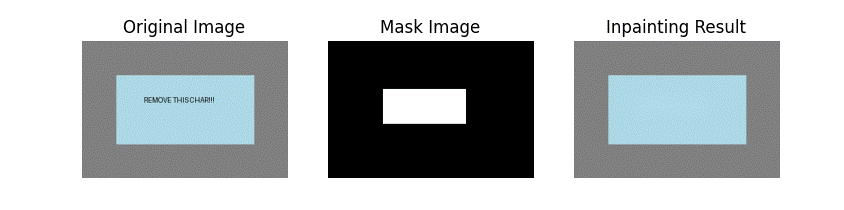 아래 예제는 제거할 텍스트 영역을 마스크로 지정한 후, Inpainting을 통해 배경을 자연스럽게 복원하는 과정을 보여줍니다. 원본 이미지, 마스크 이미지, 최종 결과를 함께 시각화합니다.